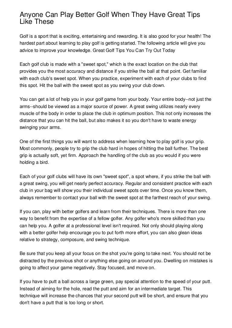 So off i would go the week before the round googling 'golf tips', 'how to play better golf', 'golf basics', 'golf help for high handicappers', 'simple golf tips', 'don't be a hacker'. It's better to do 1 thing right than practice 6 things at once so if you want to learn how to play golf better, i advise you to tackle 1 part at a time. How to improve your golf game without taking lessons. I know it's a lot, but i will help you. Since you are not a professional golfer who practices daily, the only expectation others have is that you offer pleasant company.
